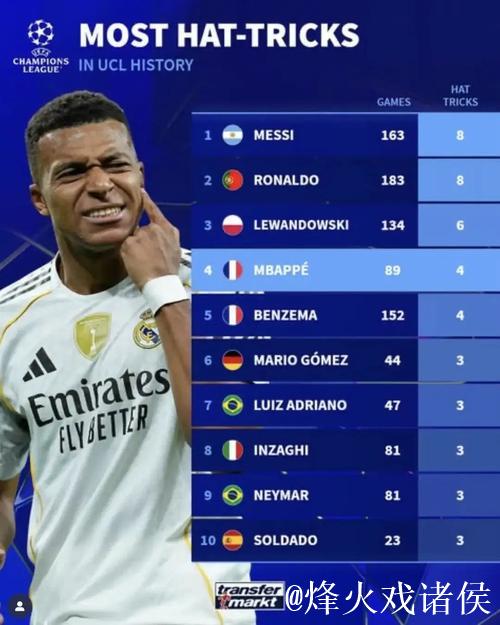欧冠赛制改革后戴帽次数榜:梅罗并列第一,莱万紧随其后